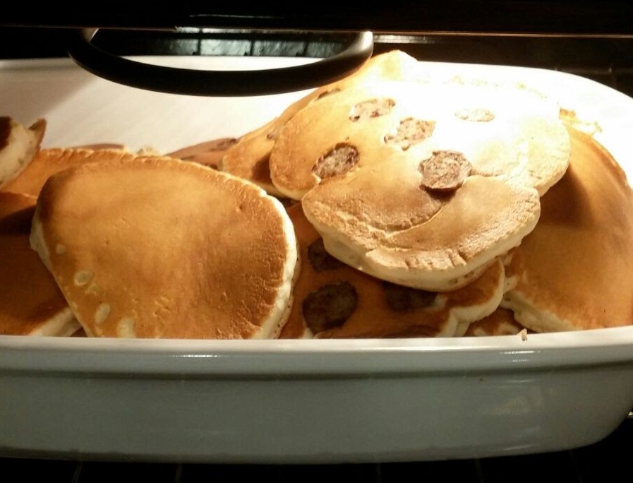 Cook up sausage links and then slice them into little chunks (each one makes 4-6 pieces). Heat a large griddle over medium or so. For each pancake, arrange about 5 sausage bits in a little group, then pour pancake batter over them – this creates the firework pattern. Cook for a couple of minutes, until first side is golden brown, then flip and cook other side.